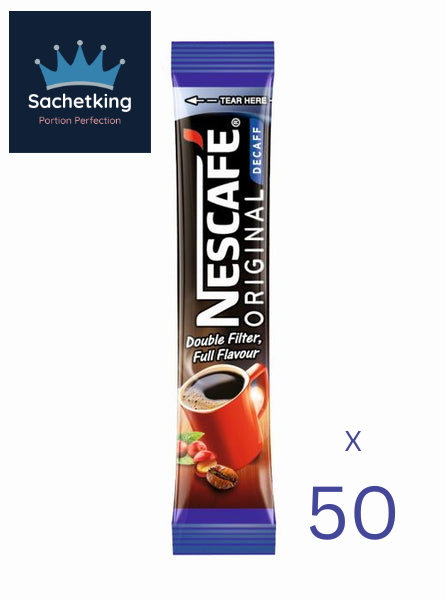 Enjoy the rich and smooth taste of NESCAFÉ Original Decaff Instant Coffee with this pack of 50 sachets. Each sachet contains the perfect amount of decaffeinated coffee for a single cup, making it an easy and convenient choice for busy mornings or when you need a quick pick-me-up. These sachets are ideal for keeping in your pantry or taking with you on-the-go.